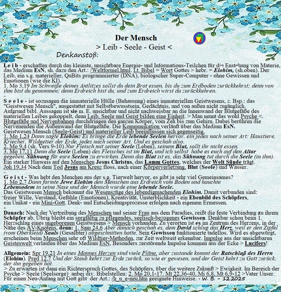 ! ! ! Folgender Tatbestand muss an dieser Stelle berücksichtigt werden > 1. Mos 2, 4-7: